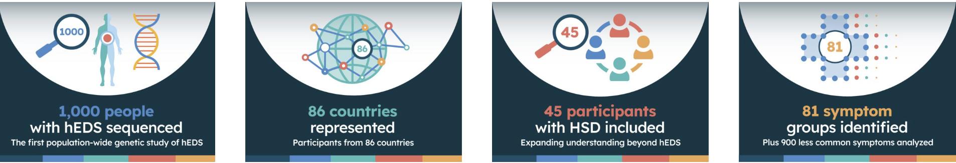 Pour les 99 % restants, le diagnostic clinique initial de hEDS (ou HSD) était correct, ce qui montre que les critères de 2017 ont été utilisés efficacement par les cliniciens et que la cohorte HEDGE est solide et fiable pour la recherche génétique.